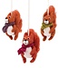 Vilten eekhoornhangers met pluizige staart en kleurrijke sjaaltjes in lichtgroen, paars en burgundy. Deze vrolijke bosdiertjes brengen direct een warme sfeer aan takken, slingers of een herfstkrans. Makkelijk op te hangen met het bevestigingstouwtje.