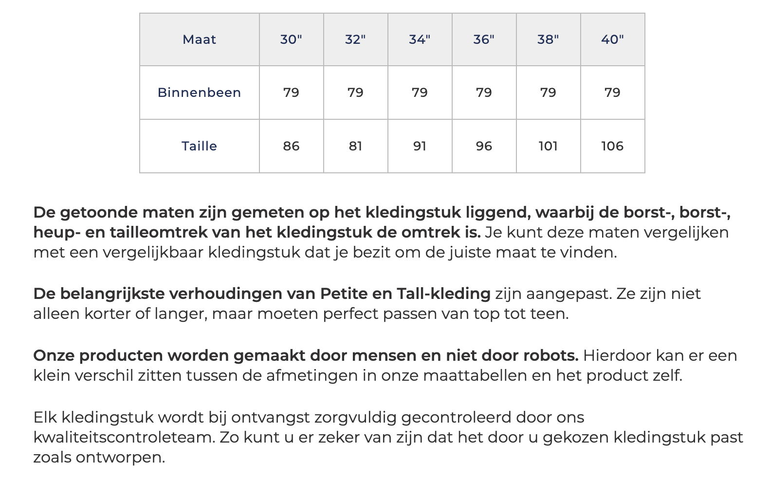 MAATTABEL: S= 30" | M=32" | L=34" | XL=36" | XXL=38"